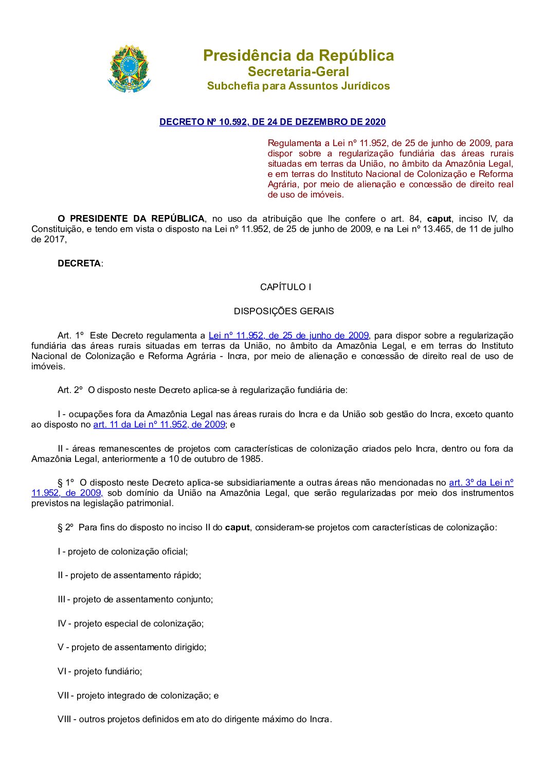 Regulamenta a Lei nº 11.952, de 25 de junho de 2009, para dispor sobre a regularização fundiária das áreas rurais situadas em terras da União, no âmbito da Amazônia Legal, e em terras do Instituto Nacional de Colonização e Reforma Agrária, por meio de alienação e concessão de direito real de uso de imóveis.