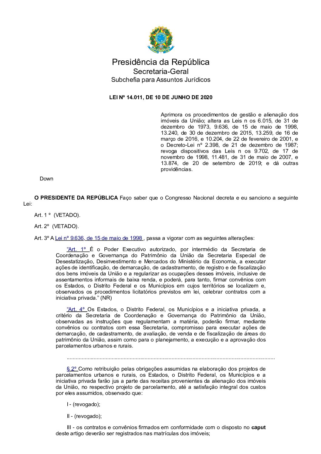 Aprimora os procedimentos de gestão e alienação dos imóveis da União; altera as Leis nos 6.015, de 31 de dezembro de 1973, 9.636, de 15 de maio de 1998, 13.240, de 30 de dezembro de 2015, 13.259, de 16 de março de 2016, e 10.204, de 22 de fevereiro de 2001, e o Decreto-Lei nº 2.398, de 21 de dezembro de 1987; revoga dispositivos das Leis nos 9.702, de 17 de novembro de 1998, 11.481, de 31 de maio de 2007, e 13.874, de 20 de setembro de 2019; e dá outras providências.