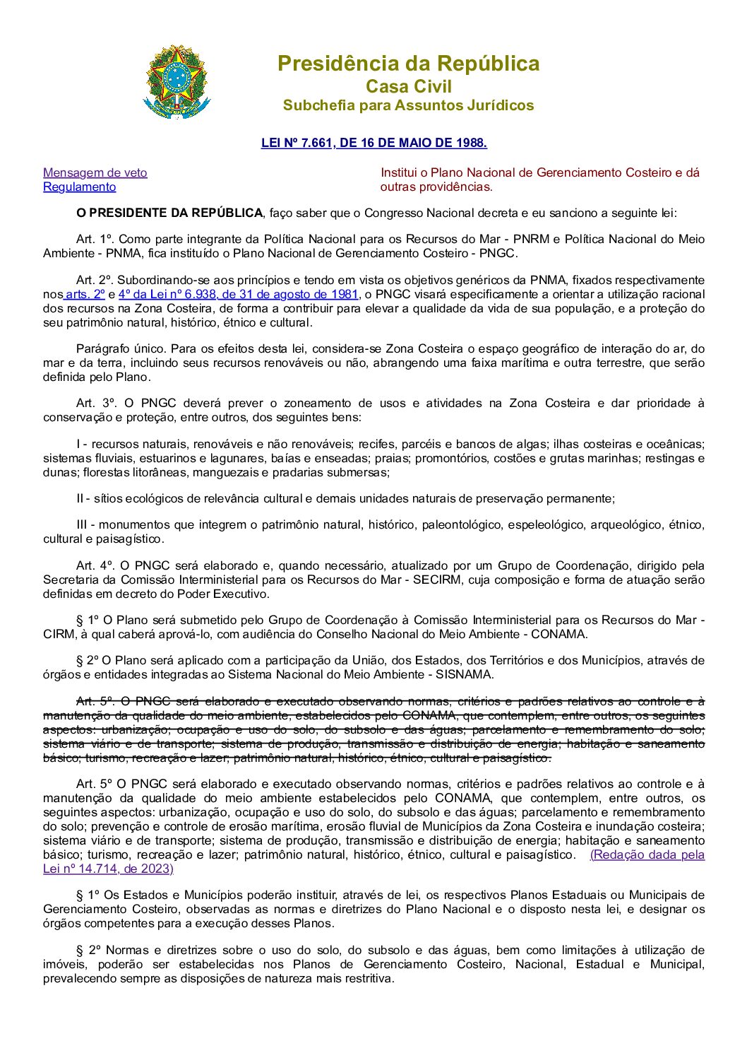 Esta Lei institui o Plano Nacional de Gerenciamento Costeiro (PNGC), parte das Políticas Nacionais para os Recursos do Mar e do Meio Ambiente. Estabelece diretrizes para o zoneamento de usos e atividades, a criação de Planos Estaduais e Municipais e a fiscalização para evitar a degradação ambiental, além de garantir o livre acesso às praias.